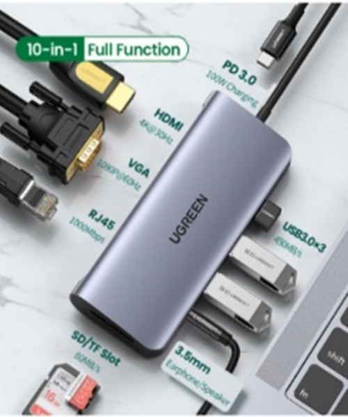 - Cáp chuyển đa năng USB-C 10 in 1 cao cấp Ugreen 80133 được sản xuất bởi thương hiệu quốc tế Ugreen với thiết kế nhỏ gọn tinh tế, chất liệu cao cấp bao gồm vỏ nhôm sang trọng, lõi cáp bằng đồng nguyên chất và các chipset xử lý cao cấp, mang đến độ bền vượt trội và khả năng kết nối tối ưu nhất. Ngoài ra, nhà sản xuất còn trang bị thêm cổng USB-C giúp kết nối sạc cho máy tính, laptop của bạn ngay khi đang xử dụng thiết bị này.